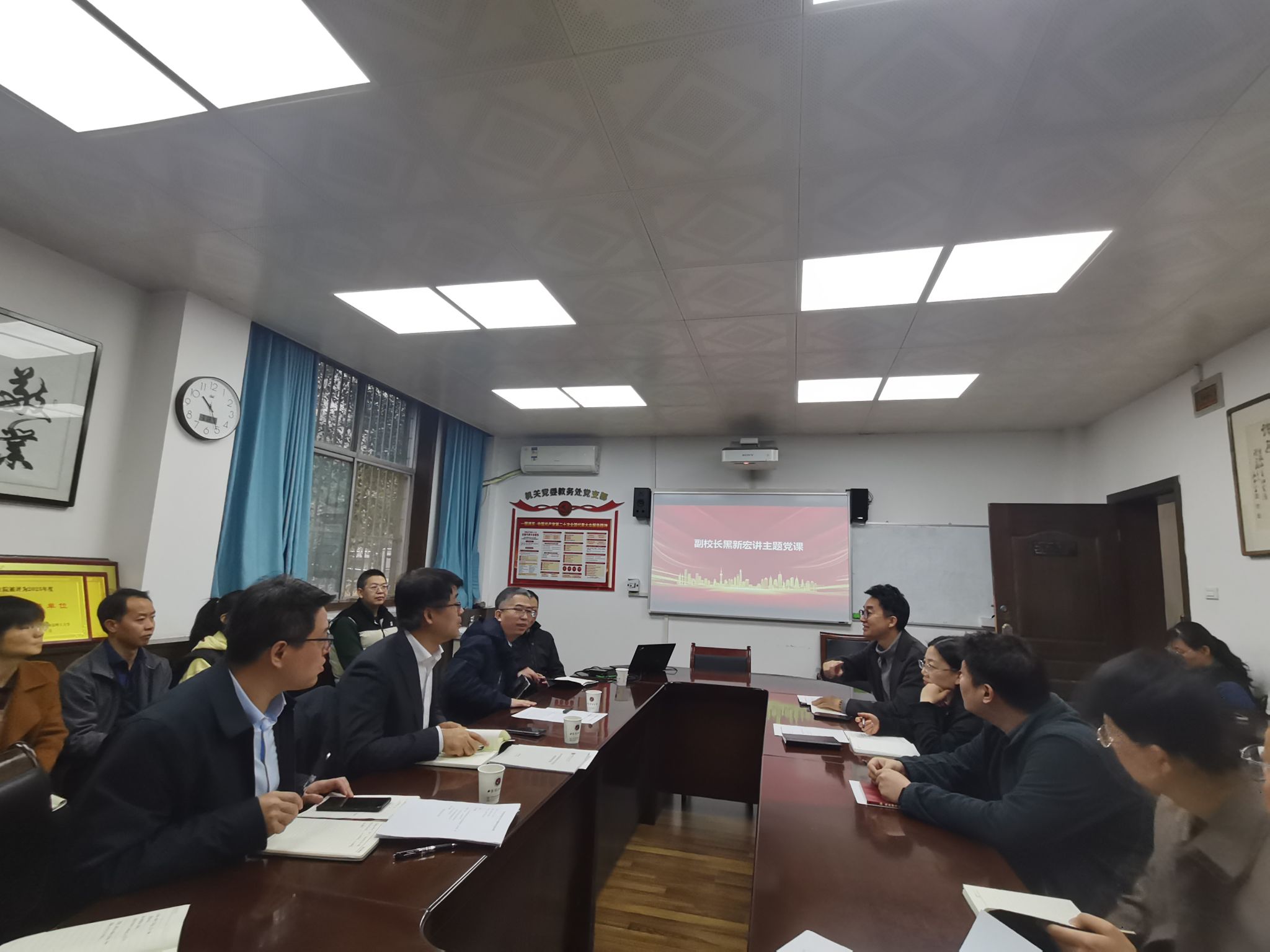 最后,黑新宏为全体党员讲授了一堂题为“认清形势、担当使命、奋发有为”的主题党课。他从当前“百年未有之大变局”切入,阐述了总体国家安全观的时代背景和现实意义,指出当前和平发展的环境来之不易,必须倍加珍惜。他强调,面对新形势新任务,全体党员要增强危机感和使命感,主动适应教育改革发展趋势,积极拥抱人工智能等新兴技术,推动管理服务创新和教学模式变革。2026年是学校“双一流”建设的决战之年,也是“十五五”规划的启动之年,全体党员要牢固树立“以学生发展为中心”的理念,深化专业与学科内涵建设,广泛开展校内外交流,开阔思路、提升能力,为推动学校高质量发展贡献智慧和力量。